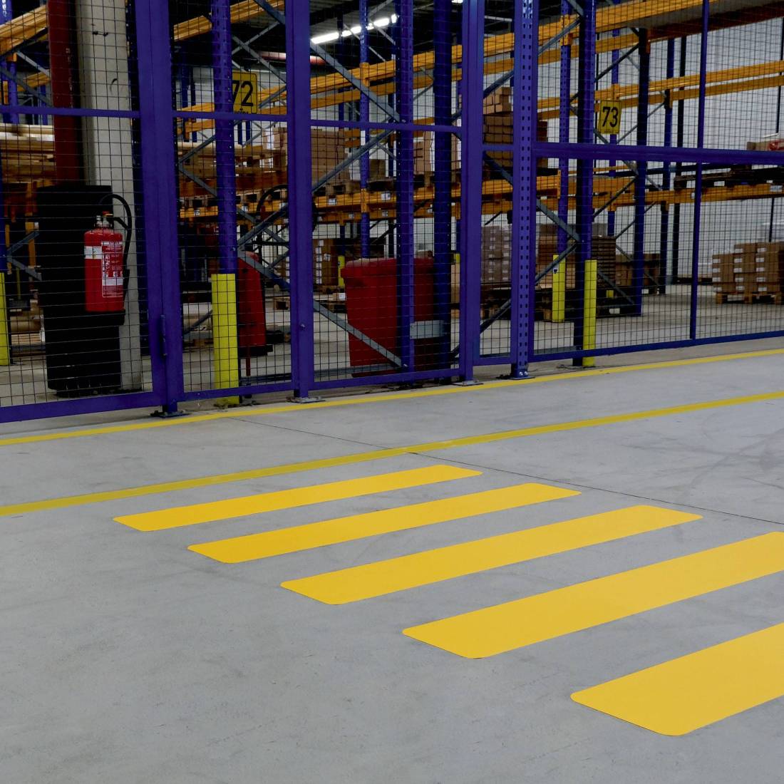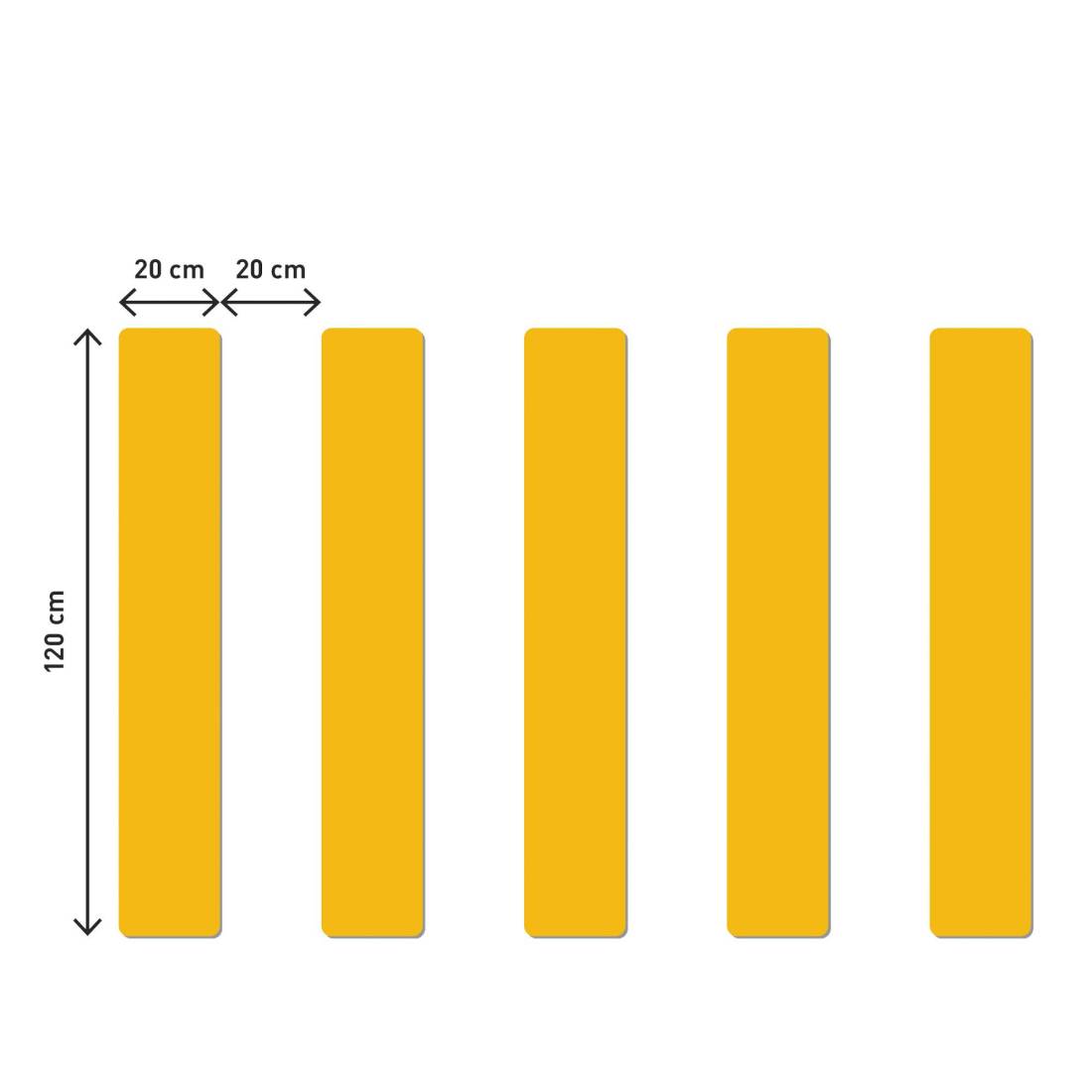 Strisce pedonali adesive per uso interno. Garantiscono una maggiore sicurezza per i pedoni che devono attraversare percorsi trafficati. Resistenza allo scivolamento (gruppo R) R9 conforme all'ordinanza tedesca ASR A1.5-1,2 "Pavimenti" secondo la norma DIN 51130. Resistente al passaggio dei carrelli elevatori, tranne per i movimenti di frenata e svolta. Applicabili su superfici asciutte, pulite, prive di polvere e grasso. Colore giallo. Dimensioni: 200 × 1.200 mm. Spessore: 0,5 mm. Striscia pedonale di ricambio cod. 104951