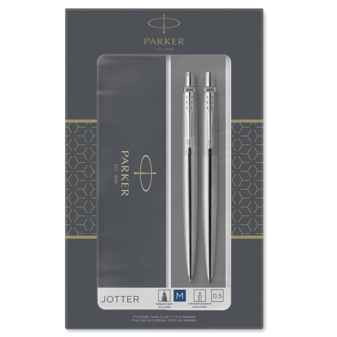 Elegante Gift Set che comprende la classica penna Parker e un portamine 0,5mm Parker con fusto in acciaio inossidabile e dotato di chiusura a punta di freccia lucida sempre in acciaio inossidabile. La penna è fornita di refill Quink Flow colore blu e un esclusivo astuccio regalo. Colore: stainless steel CT.