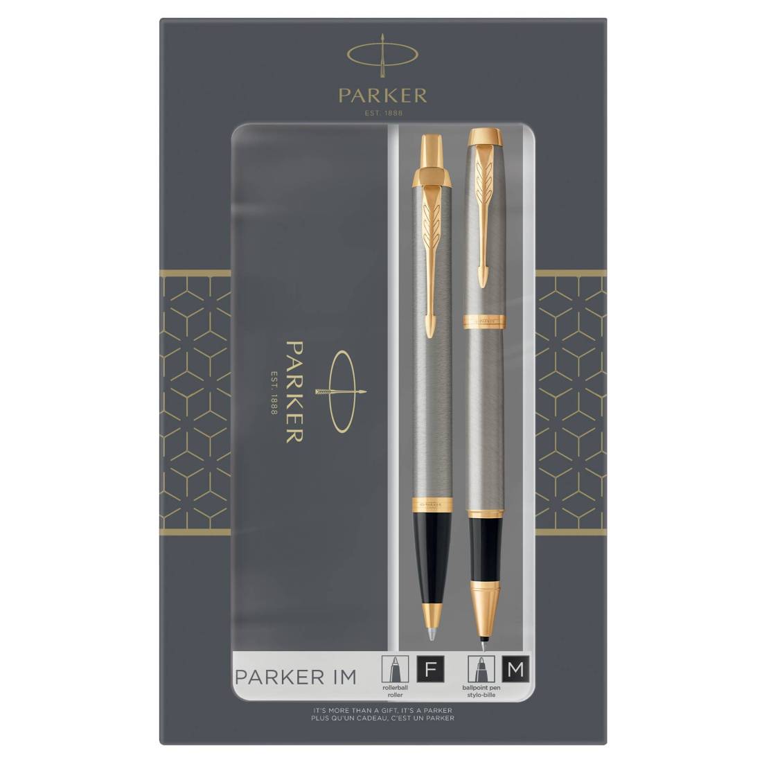 Elegante set in confezione regalo che comprende penna a sfera M IM Brushed Metal GT + stilografica M Brushed Metal GT. Realizzate in acciaio inox con eleganti dettagli cromati. Dotate dell'iconica clip a freccia Parker. Fornite con refill colore blu.