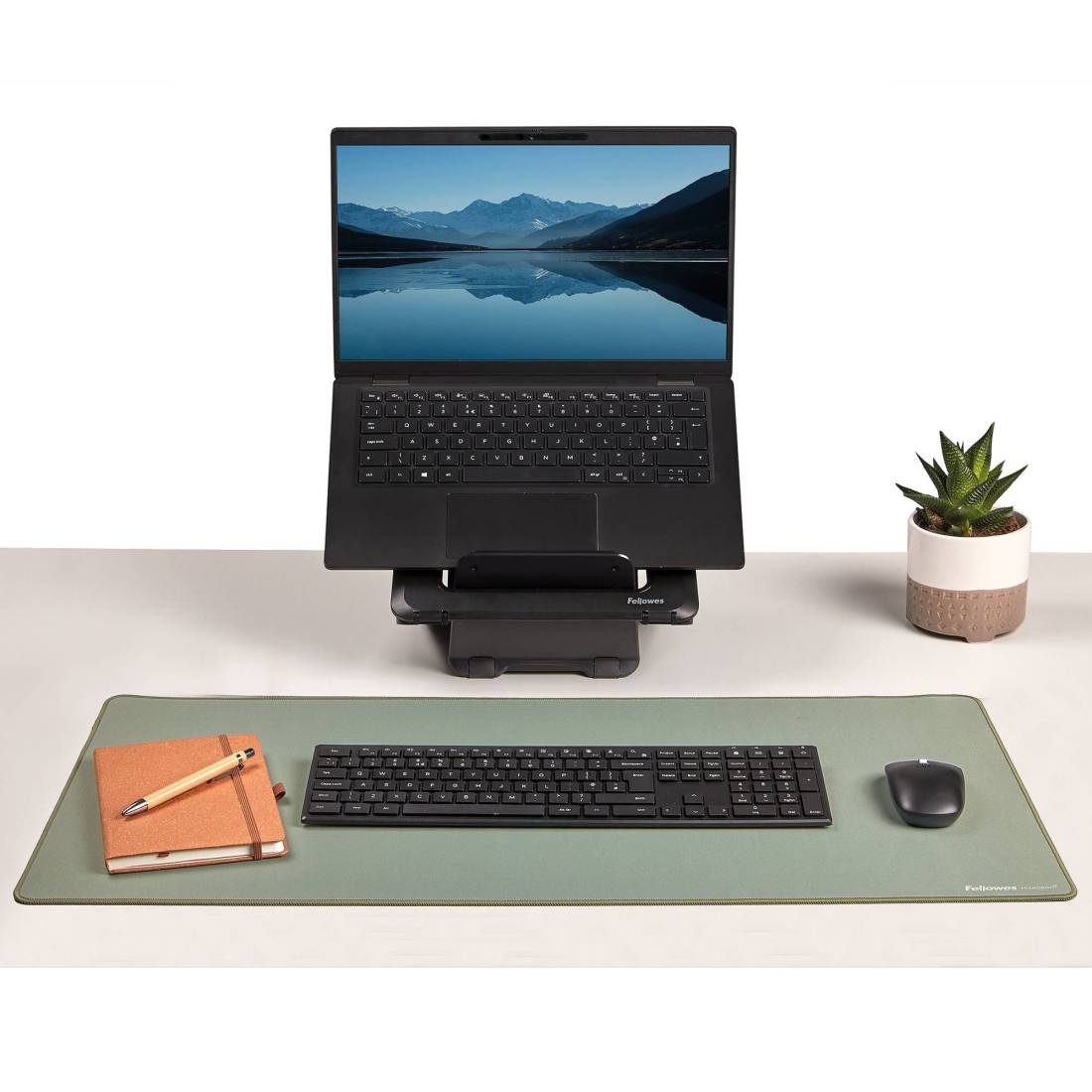 L'ampio tappetino da scrivania protegge dallo sporco e dai graffi e crea una superficie di lavoro priva di riflessi. La protezione Microban® integrata aiuta a prevenire la proliferazione dei batteri, per un livello aggiuntivo di protezione del prodotto. Realizzato con l'83% di materiale riciclato post-consumo. Costruito per durare con una garanzia di 5 anni.
