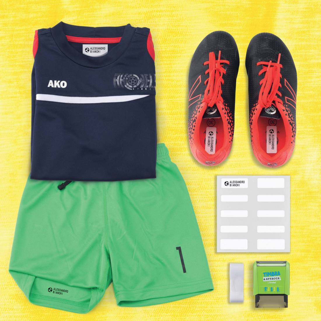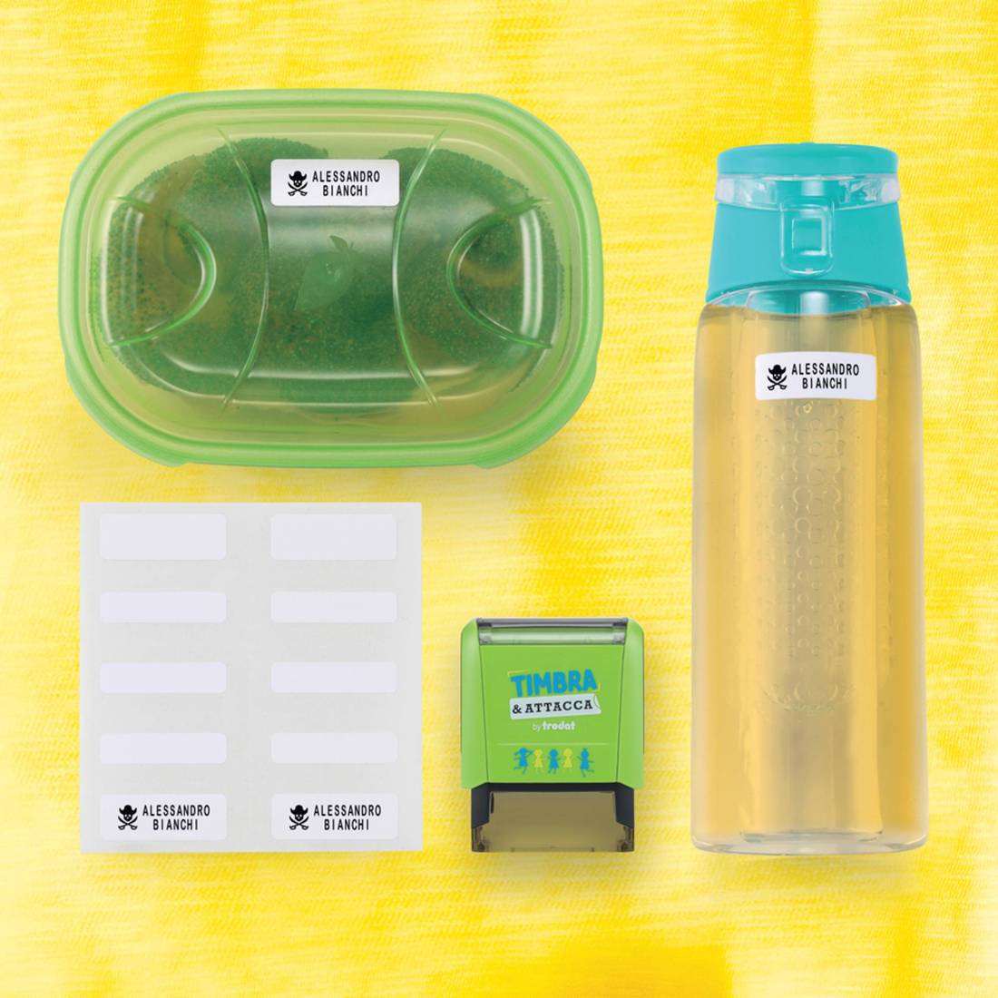 Timbra direttamente su tessuto, carta, cartone, etichette adesive e attaccale ovunque: scarpe, tupper ware, giocattoli, matite, etc. Combina il tuo testo con le simpatiche icone, altezza caratteri 4mm; fino a 14 caratteri per riga e max 3 righe.