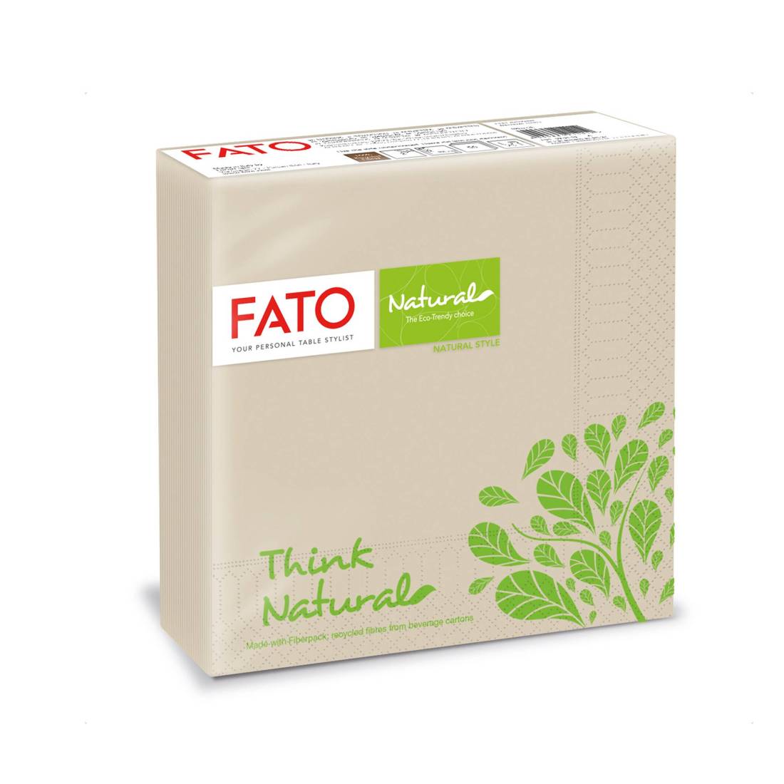 FATOConfezione da 50 tovaglioli di carta 33x33cm. 2 Veli. Linea: Natural Style. Stampa sul tovagliolo "Think Natural". Colore scritta e disegno verde.